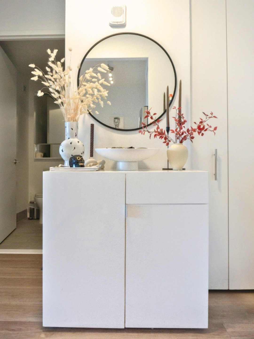First impressions in a small apartment are set within about four feet of the front door, which means the entry deserves more deliberate attention than it usually gets. Ours functions as a transitional moment — a narrow zone that signals immediately what kind of apartment you're walking into. A single hook rather than a coat rack. One small surface for keys and nothing else. The temptation to treat an entryway as overflow storage is real; resisting it is one of the single highest-return decisions you can make in a small space.